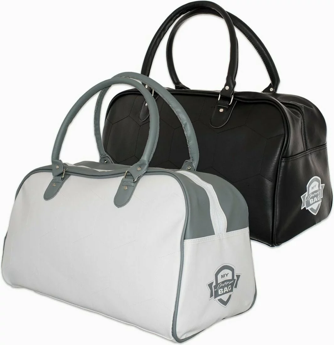 Спортивна ретро сумка зі штучної шкіри білого та чорного кольору бренду My sport bag. Торба має 2 великих відділення і 3 маленькі кишеньки для телефону, грошей і ключів. Оснащена 2-ма міцними ручками та 5-ма сталевими шпильками на дні сумки. Закривається на замок із двома бігунками.